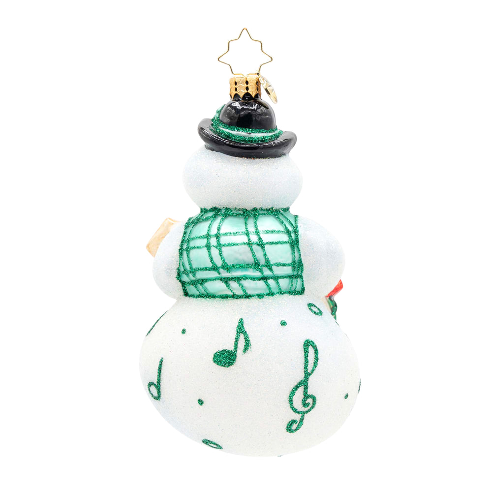 North Pole Notes. Snowman ornament wearing a green scarf with details of music notes and playing a green and brown banjo. View of front