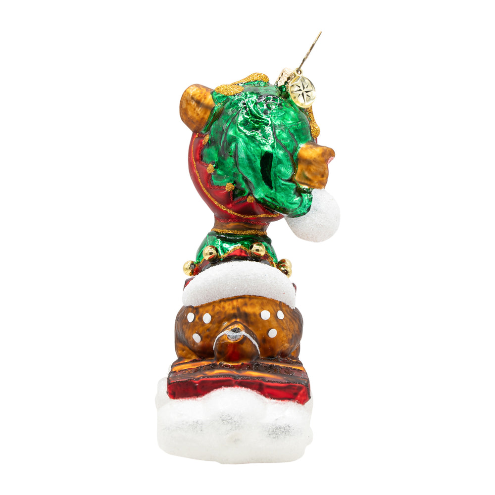 Sledding into the Season. Ornament of a reindeer dressed in a red and green elf suit on brown and red sled. View of front,