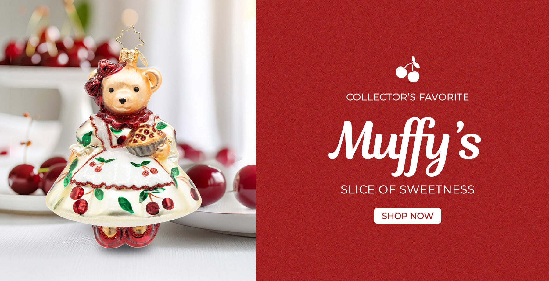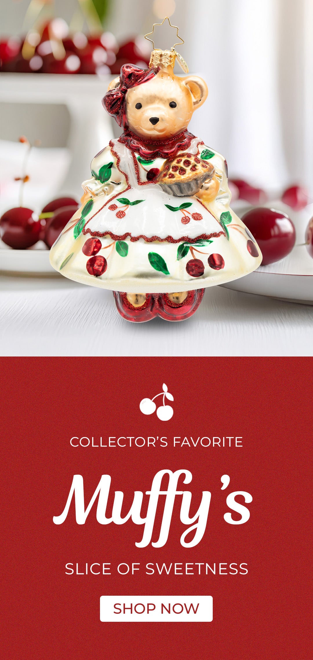 Muffy's Slice of Sweetness. A bear ornament, dressed up in a white dress with cherries and holding a cherry pie. View of front