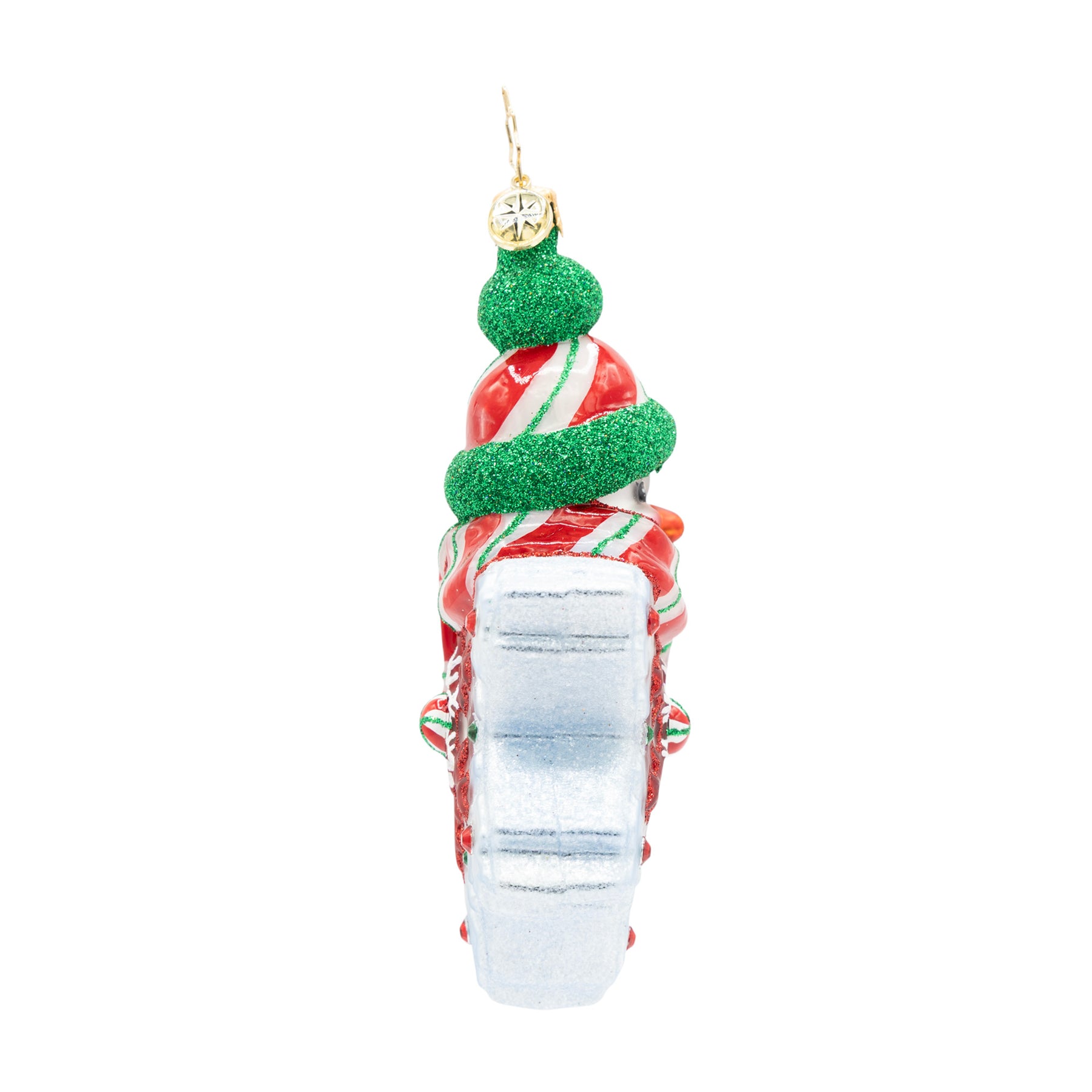 Please note: This item is currently out of stock and available for preorder. It is expected to ship in Spring of 2026. Add a frosty touch of sweetness to your holiday season with our Snowflake Sparkle ornament. A cheerful snowman, wearing a glittery hat and a striped scarf, sits atop a magnificent snowflake. The snowflake, adorned with shiny red and green gems and a shiny peppermint at its center, is a work of art. This piece is a perfect blend of classic winter charm and festive holiday fun. Exclusively available at www.christopherradko.com.